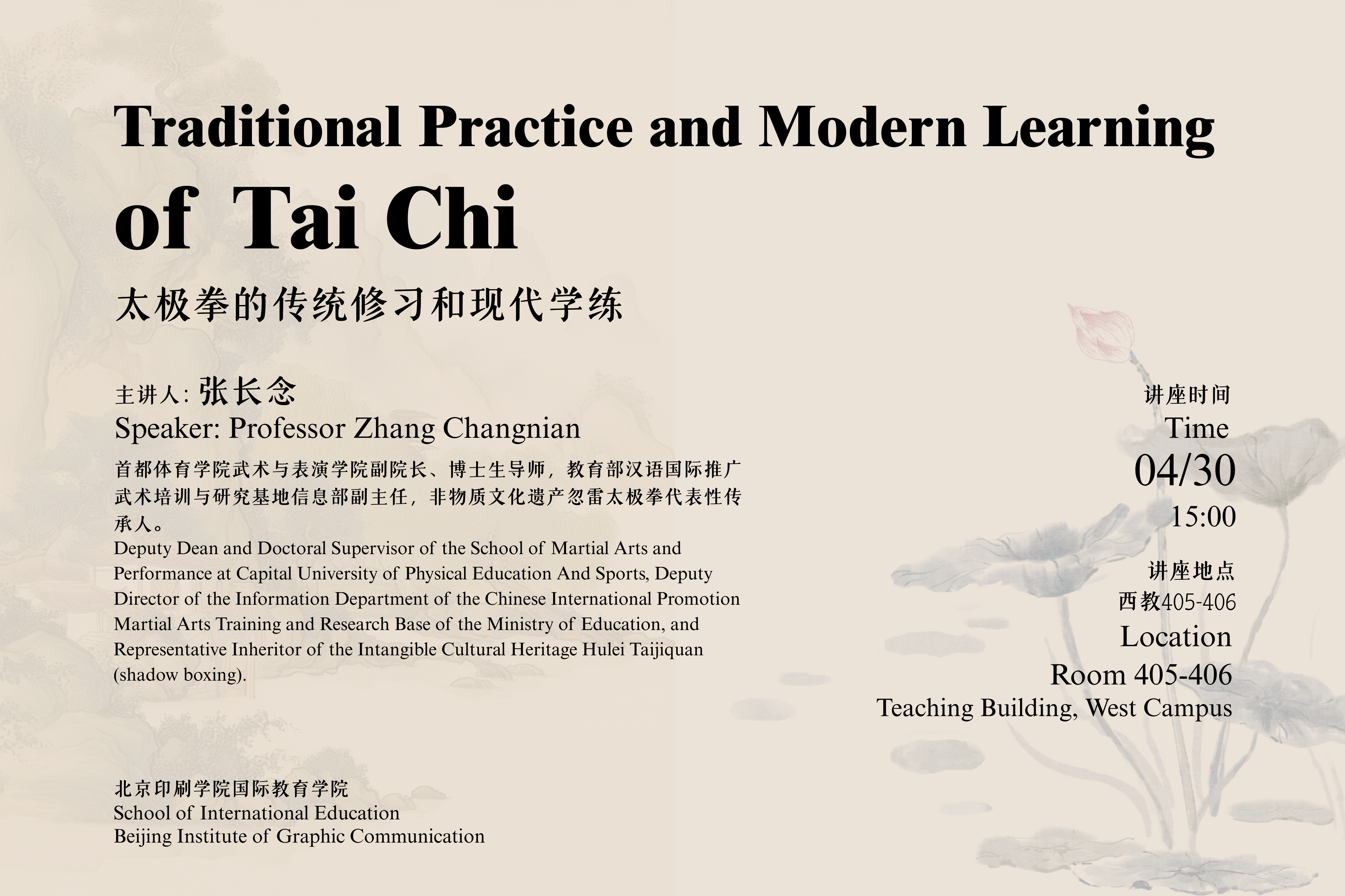 主题:太极拳的传统修习和现代学练(讲座语言:英文)