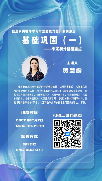 为促进书院学风建设和学生学业发展,更好地为学生提供分层次、多维度的精准学业帮扶,结合信息大类学生学习情况现状,北航学院现拟定信息大类《工科数分》期末主题辅导讲座需求及时间安排。其中分别面向重点帮扶学生群体、所有学生、学有余力的学生开展。经课程团队与书院管理团队进一步研讨,最终确定8次主题讲座,详细安排请见下表:
