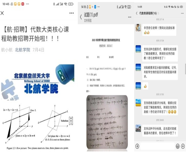 助教工作的第一步就是要把好入口关,即招聘到合格的助教,避免“批改作业只画√,批改试卷乱判案,学生答疑顾左右,助教主讲两条线”等近年来助教质量凸显的难题。这次助教招聘,针对代数助教常见薄弱环节,着重检测代数基础和逻辑素养,包括对基本概念的区分,对论域前提的知悉,对学生做法的判断等。为了有效的完成这次助教选拔,代数大类的老师们和北航学院的相关工作人员从暑假开始就展开了相关工作,从7月4日开始到8月18日结束。