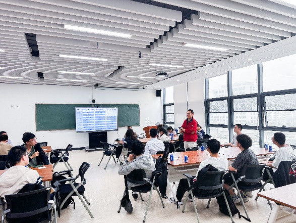 应用数学系系主任郑孝信向同学们介绍了应用数学系的基本情况。郑孝信表示,应用数学系教师团队以分析和方程为主体研究方向,涉猎人工智能、复杂网络、信息安全等热门前沿方向,是充满活力、经验丰富、兼顾应用导向与理论研究的团队。