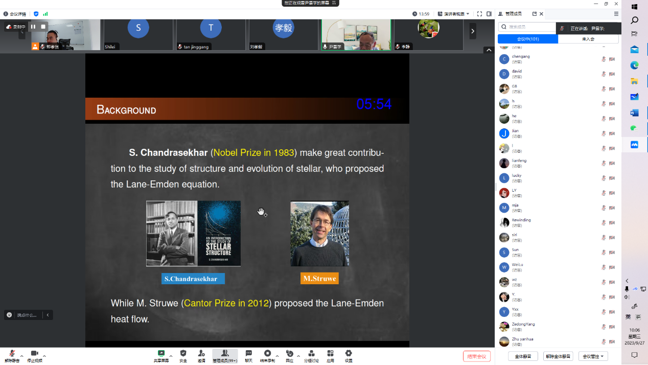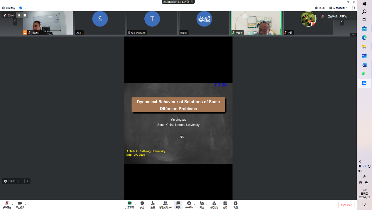2023年9月27日上午,华南师范大学尹景学教授应邀为今年会官方网站师生做了题为 “Dynamical Behaviour of Solutions of Some Diffusion Problems”的学术报告。 此次报告由应用数学系郑孝信老师主持,相关研究领域的师生参加了本场报告。