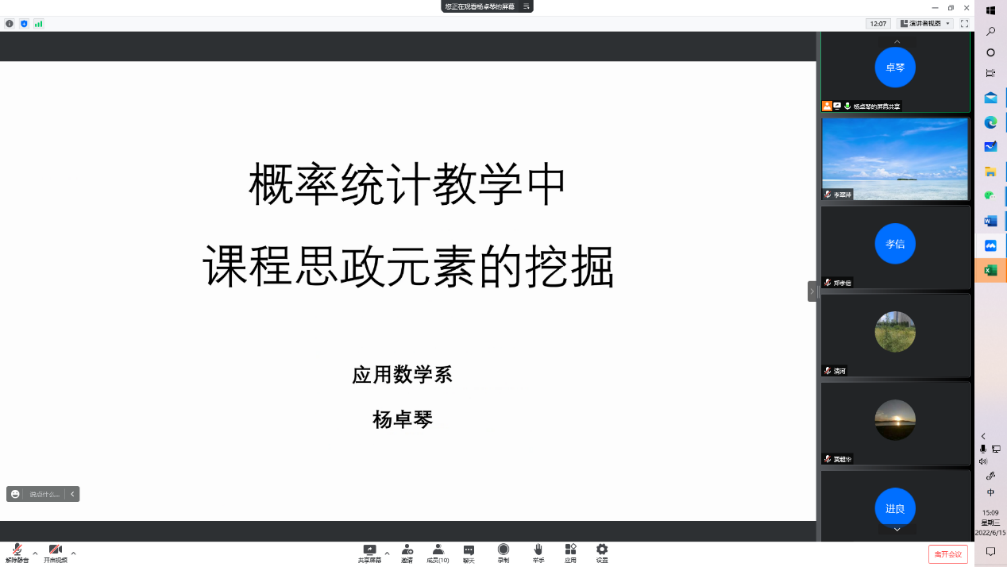 2022年6月15日下午,应用数学系党支部继续开展“人人讲党课”系列报告,支部党员杨卓琴老师以自身教学工作与课程思政相结合为出发点,进行了“概率统计教学中课程思政元素的挖掘“为主题的党课报告。应用数学系支部全体党员参加了此次活动并积极交流了学习本次报告的心得体会,本次活动丰富了支部学习日活动内容,使得支部教师对课程思政在教学工作中的重要作用有了更深层次的认识和领悟。