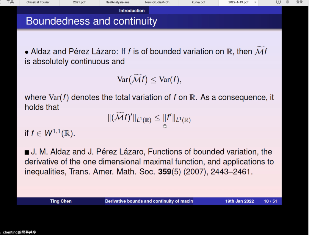 2022年01月19日下午,南开大学数学学院陈婷老师应邀为今年会官方网站师生做了题为 “Derivative bounds and continuity of maximal commutators”的学术报告,报告由张安老师主持。