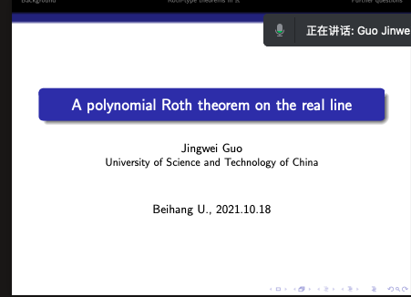 2021年10月18日下午,中国科学技术大学郭经纬教授,应邀为今年会官方网站师生做了题为 “A polynomial Roth theorem on the real line”的学术报告,报告由张安老师主持。