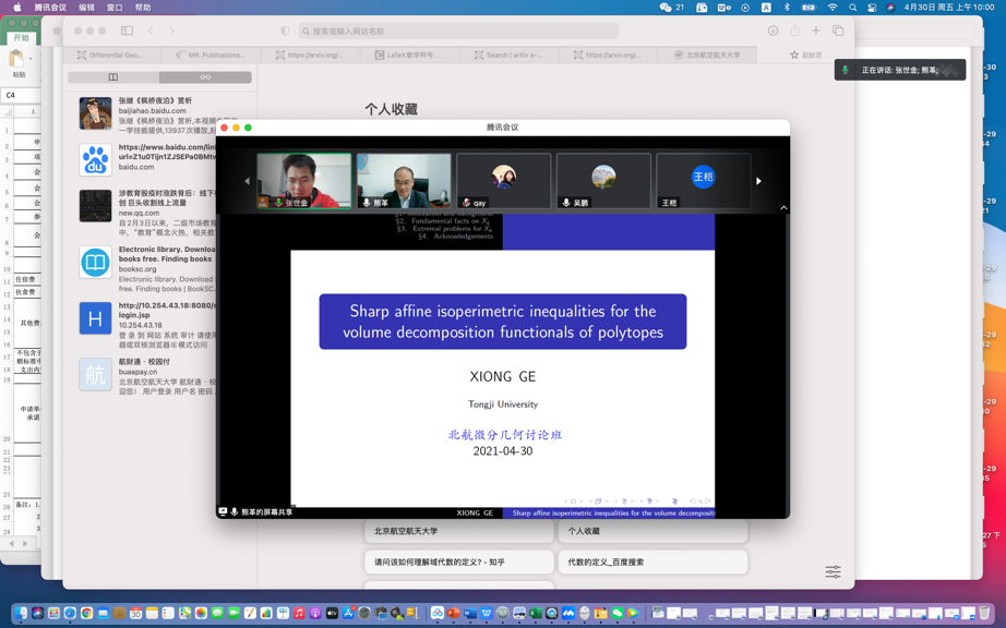 2021年4月30日上午,同济大学数学学院熊革教授受邀为今年会官方网站师生做了题为“Sharp affine isoperimetric inequalities for the volume decomposition functionals of polytopes”的线上学术报告,报告由张世金老师主持。此报告为数学学院几何团队每周五上午讨论班的学术报告。