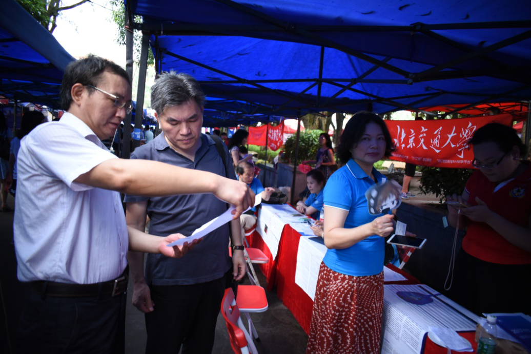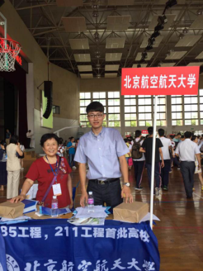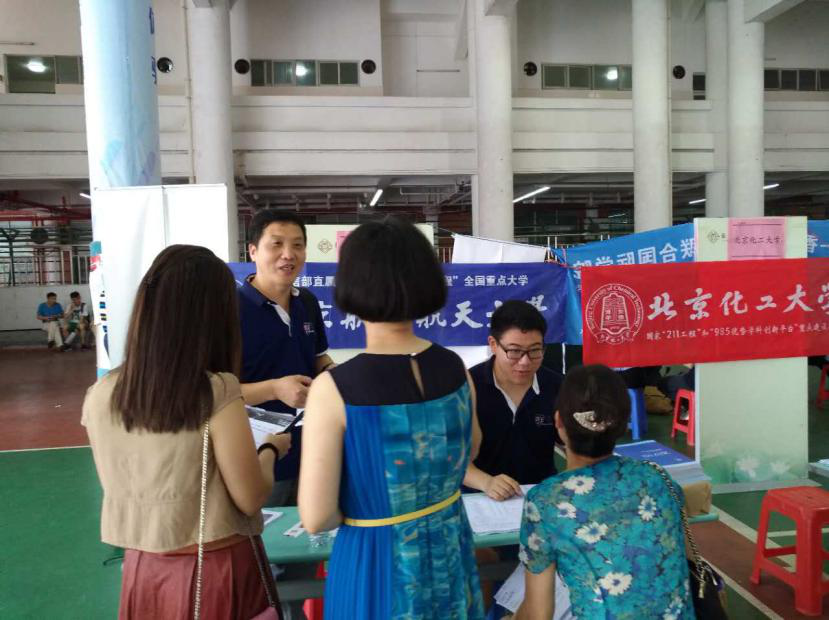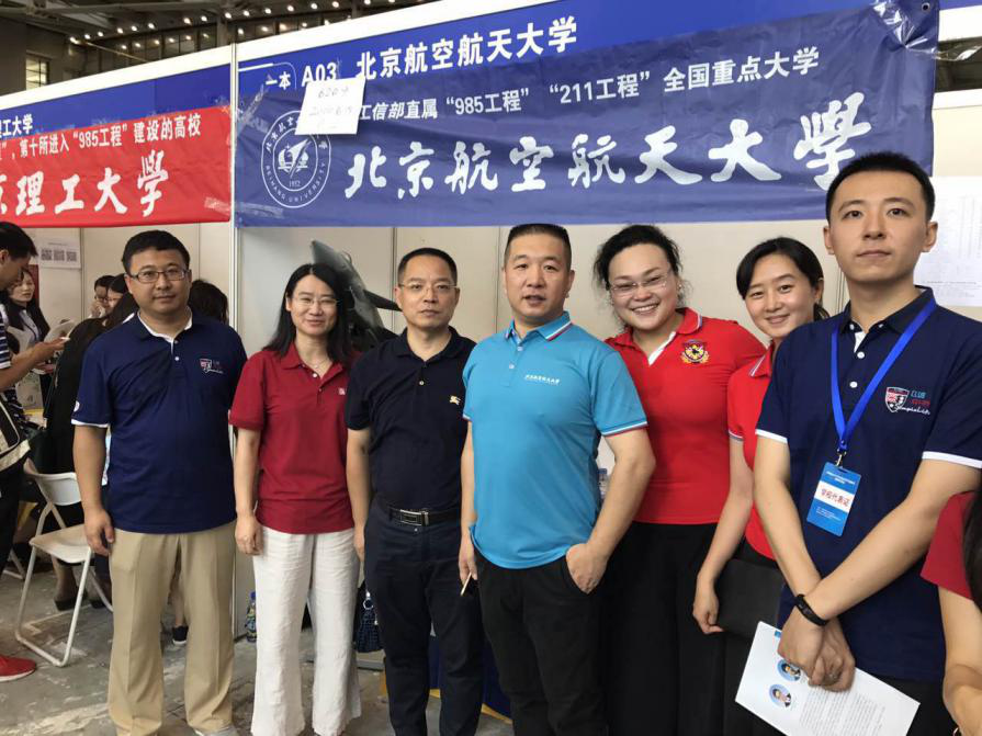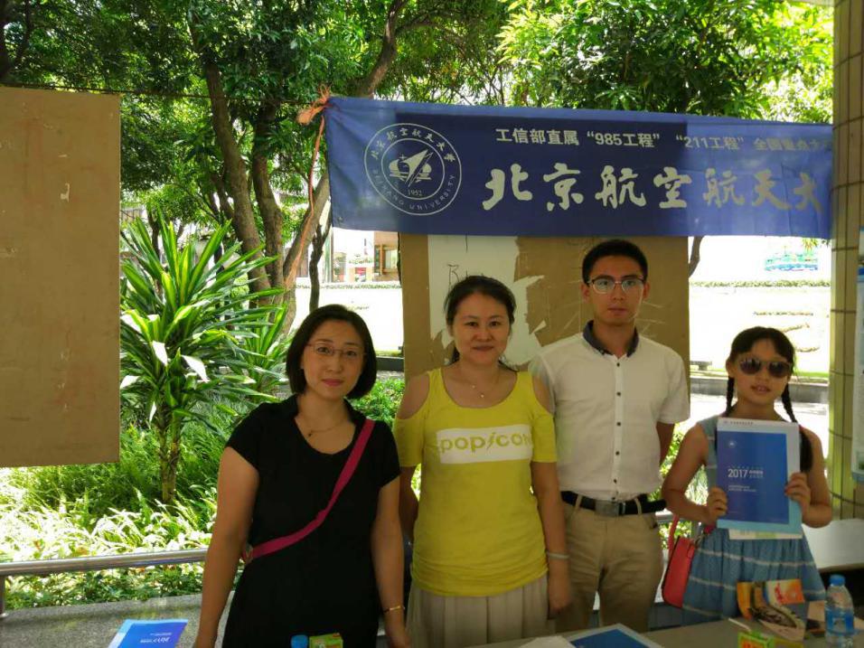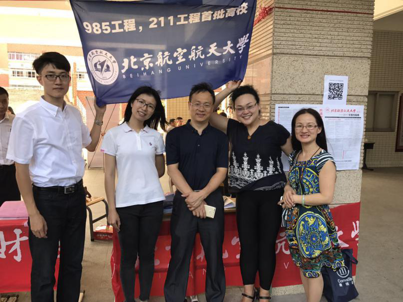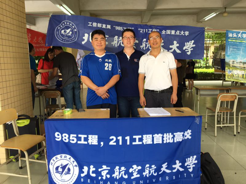 拥有优质的生源是建设双一流大学的充要条件,也是展现高校综合实力的一个重要指标。根据学校招生宣传工作安排,2017年6月23日至7月2日,数学与系统科学学院党委书记李红捷、副书记丁丁、韦卫副教授、孙玉泉副教授、生物与医学工程学院乔惠婷副教授等一行10人先后赴广东省各市区开展招生宣传活动。此次招生工作得到了广东省校友会、深圳校友会、佛山校友会以及珠海校友会的大力支持,招生团队从2017年5月就开始建立微信群酝酿宣传方案,规划工作路线,充分借助校友资源,积极挖掘人际媒介,进一步加强北航在华南地区的影响力。在正值酷暑的招生宣传期间,北航赴广东招生工作组得到了校友们在衣食住行方面无微不至的关怀,在广东省校友会的全程协调下,共有百余位优秀的校友参与了招生宣传工作,共同出谋划策,倾力奉献。其中广东校友会张滨滨秘书长及佛山校友会关琪副会长个人赞助了所有招生老师和志愿者的工作服装。广东校友会张滨滨秘会长、佛山校友会李杰副会长、胡湘洪校友、胡振校友、夏虎校友、李正汉校友、马骋校友、刘娟校友等热情帮助招生组安排专车或亲自驾车护送招生老师城际穿梭,有效提高了工作的效率。