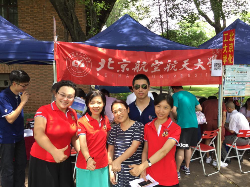 深圳校友会梁建军秘书长(左三)和富察锡凯副会长(左四)及校友参加深圳市高招咨询会工作广州篇——三代校友风华并茂,赴粤招生之坚强后盾在广州,为期5天的招生宣传工作得到了近40位校友的鼎力帮助。在炎热的夏季,广东校友会会长李罡带领着跨越40岁年龄差的校友们积极主动地响应广东招生工作组的号召,不辞辛劳地去到中山大学、华南理工大学、广州市高考招生咨询会、广东实验中学、广雅中学等近十处招生宣传点,为今年的考生宣传北航的文化和情怀,现身说法介绍北航目前的发展和就业工作情况,点燃高考生心中的航空航天报国梦想。广东校友会李罡会长初中期间,曾是广州市铁一中学的学霸,此次亲赴少年时代的校园,见证北航招生会场人气聚集,场面火爆。校友会张滨滨秘书长在广州市高招会现场妙语连珠,艺术家的气质加上爽朗的话语,吸引了大批考生和家长,并代表北航接受广州电视台专访。广东校友会赵宪明师兄主动担当招生活动摄影师,多个招生会场同时铺开,赵师兄就一早跑好多会场,精彩照片接连不断。彭程师兄在华南理工大学的咨询会中帮忙打印资料和拍摄视频,并将北航宣讲视频精心制作并上传优酷网站。与此同时,我校59级的元老校友郭永钊来到华南理工大学开放日现场看望北航,在广雅中学的咨询会中老校友张桂基也风尘仆仆的赶到参与宣传工作,这些都使招生老师倍感亲切和感动。不仅仅是校友,在华师附中,更有一名学生家长到现场来志愿帮忙。