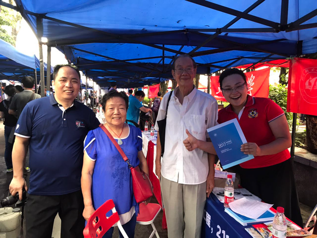 李汉东副会长(右一)在深圳高级中学咨询会上为考生家长介绍学校