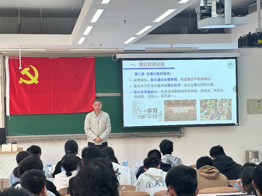 开班仪式后,陈志英主讲《学习党章,履行党员义务》主题党课。他从党员的义务引入,围绕“学习、模范、贡献、守纪、忠诚、批评、群众、牺牲”八大关键词,强调牢记党员八项义务是践行理想信念的基石。结合大学生群体特点,陈志英对学员们的综合素质提出更高要求。他表示,大学生不仅要具备完备的知识体系和研究能力,还要具备逻辑思维,辩证思维,批判思维的科学素养;爱与情,和与美,诚与信的人文情怀;攻坚克难,持久耐力,抵抗挫折的身心健康。