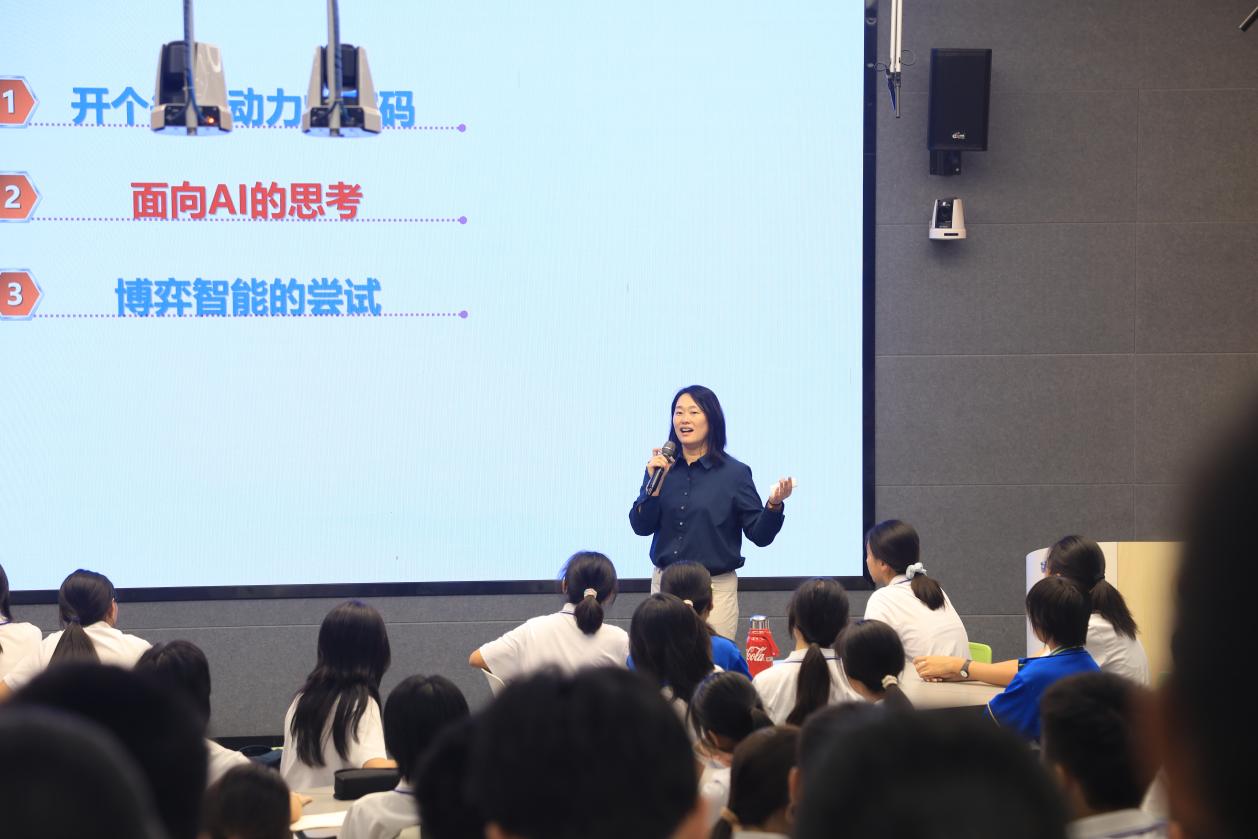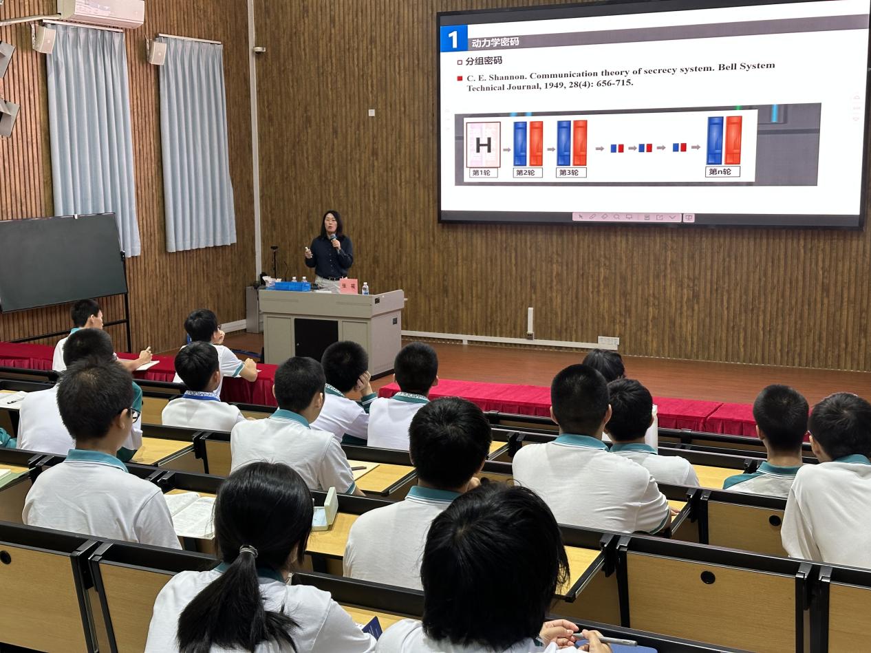 张筱教授面向广东广雅中学和广州市第六中学共400余名学生主讲《从空天密码到博弈智能》讲座。她从动力密码学出发,科普了部分领域中密码的计算速度和安全强度,进而引申到人工智能对于密码学的参与和改变,并从博弈智能的角度科普了平均场博弈原理,引导学生感受数学的基础性支撑作用 ,浸润空天报国的使命担当。