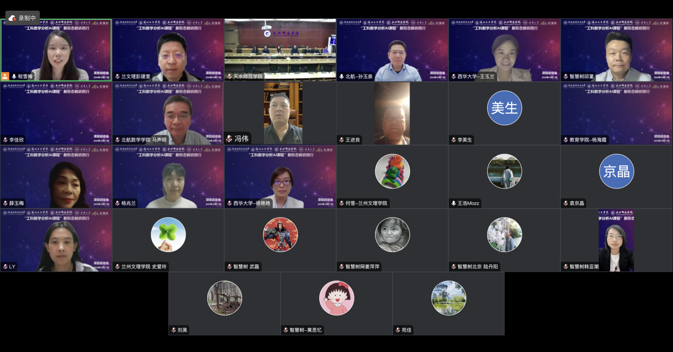 经过精心筹备,于2024年10月17日,四校联合举行“工科数学分析AI课程”教研西行项目启动会议。本项目是“慕课西部行”活动中北京首个以AI课程开展新形态教研西行的项目,四校教师团队通过“智慧树”平台云端相聚,共享共创,交流互通。