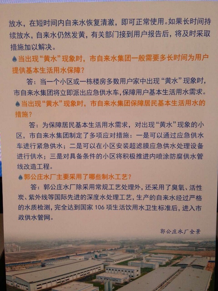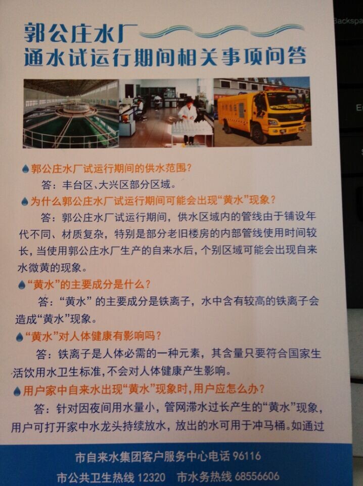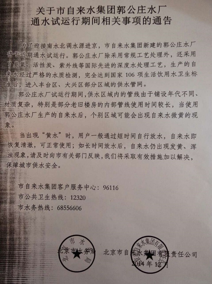附件1:关于市自来水集团郭公庄水厂通水试运行期间相关事项的通告
