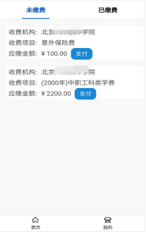 在首页选择“我要缴费”,或者进入“我的”界面,查看具体缴费信息。点击“支付”进入缴费流程。