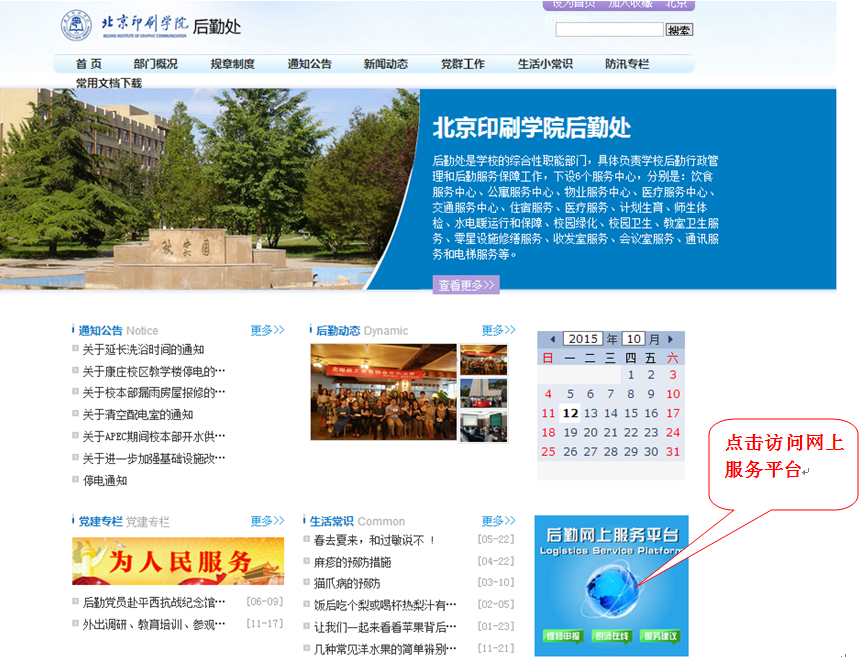 微信菜单栏中链接的服务功能也可以通过后勤处主页链接到,在PC端浏览器中使用。